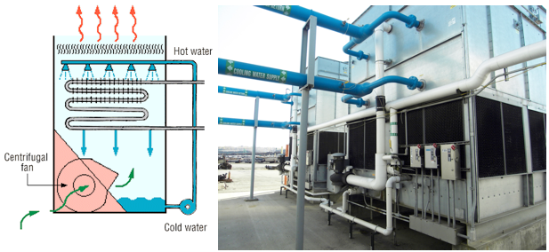 A closed-loop dry cooling system is very much like the radiator in your car. The system uses an air-cooled fluid cooler to transfer the heat from the closed-loop coolant fluid pumped through rows of finned tubes that have ambient air blown/drawn across them. The basic components to a closed-loop dry cooling system are the fluid cooler, which contains the air to liquid heat exchanger with the fan/s, the pump and control skid, the coolant, and the field installed system piping. The closed-loop dry cooling system fluid cooler will be located outside and use the ambient air to reject the heat. Coolant temperatures of 5 to 10 F above the ambient dry bulb temperature are possible with a closed-loop dry cooling system. The system is relatively inexpensive to operate with only the coolant pump and the fluid cooler fan/s using energy. The fan/s are thermostatically controlled to regulate the temperature of the cooling fluid so that the load is not over or under-cooled. Periodic cleaning of the fluid cooler may be necessary due to dirty atmospheric conditions at the site location. Fouling of the fluid cooler is typically caused by dirt, leaves, cotton-wood seeds, etc.