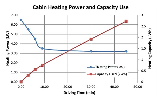 Equivalence of heating capacity to electrical power consumption shows how much is saved by using thermal storage for typical commute lengths.