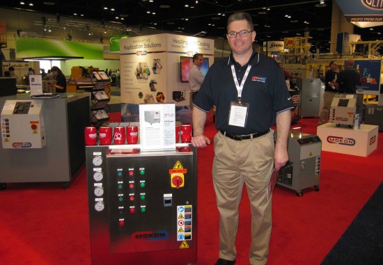 Mokon Technical Sales Engineer, Jim Tubinis, next to their water-based Full Range combination chiller/heating system.