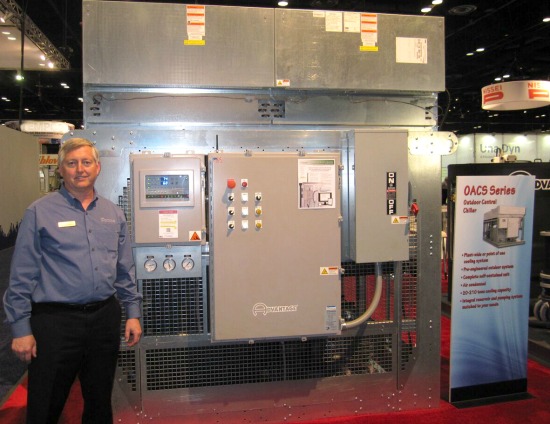 Andy Patton, from Multistack, next to their new MP10-80 ton chiller featuring 15 Ton VSD and fixed speed refrigeration compressors.
