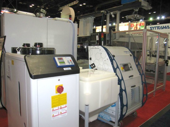 While Frigel is present in many end use markets, the company has truly specialized in process cooling for plastic injection molding, blow molding, thermoforming and extrusions. Their North American headquarters is a 40,000 square foot facility located near Chicago. The company displayed their Ecodry 3DK closed loop adiabatic liquid cooler, designed to reduce water and energy consumption. “As there is no evaporation of process water, the Ecodry 3DK can reduce water use up to 95% vs. a cooling tower,” according to Frigel Global Marketing Manager Al Fosco. “An average 100 ton system can save up to 1 million gallons of water per year.” The unit features an internationally patented adiabatic chamber permitting high temperature ambient condition installation. Energy savings are achieved by the free cooling mode and by brushless, variable speed motors powering the fans. Lou Zavala, Frigel’s National Sales Manager, said the market for energy and water-efficient chillers is in it’s early stages and gaining momentum. “Particularly out West, we are seeing more and more demand for chiller technology able to deliver water and energy savings.” Visit www.frigel.com.