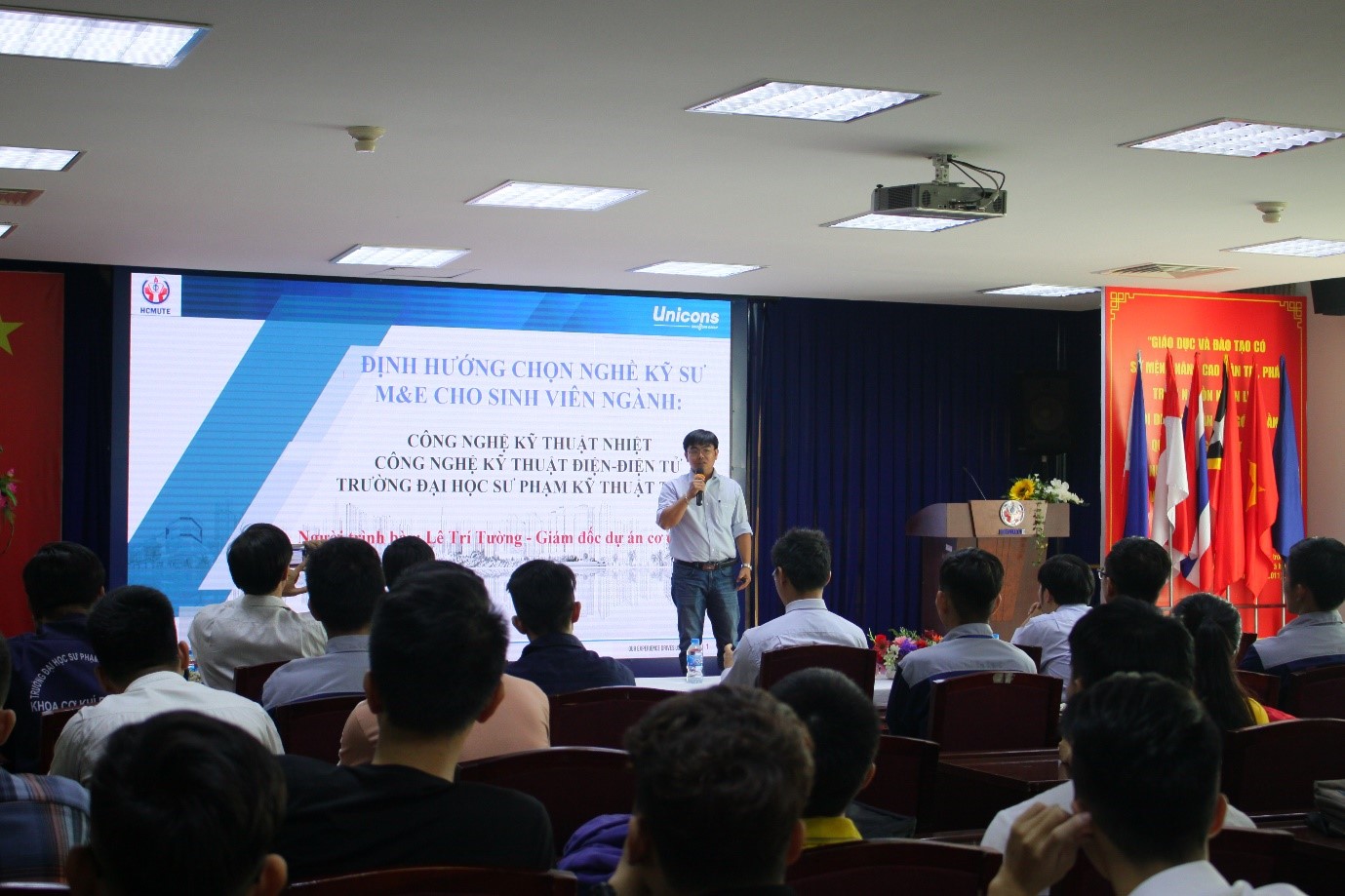 Vấn đề chọn nghề nghiêp, kinh nghiệm phỏng vấn là rất quan trọng đối với sinh viên năm 3 và sinh viên năm cuối để có thể chuẩn bị tốt hành trang cho bản thân bước ra ngoài đời thật sau khi ra trường. Thế nên trên cương vị là một doanh nghiệp, một công ty lớn thì Công ty Unicons đã quyết định phối hợp với khoa Cơ khí Động lực và khoa Điện- Điện tử của trường Đại học Sư phạm Kỹ thuật TP. HCM để tổ chức hội thảo “Định hướng nghề nghiệp” để chia sẻ và mang đến nhiều cơ hội cho sinh viên của hai khoa nói riêng và toàn trường nói chung.