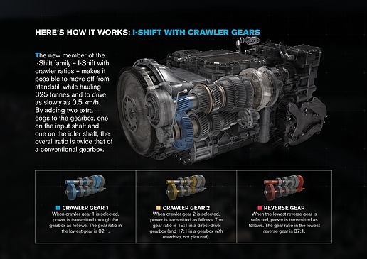 I-Shift with Crawler Gears will be available in two versions: 14 forward gears, including one low crawler gear (19.38 gear ratio) and one ultra-low crawler gear (32.04 gear ratio), which can operate down to 0.6 mph with 3.58 rear axle ratio; and 13 forward gears, including one low crawler gear (17.54 ratio) and an overall ratio of 22.35.