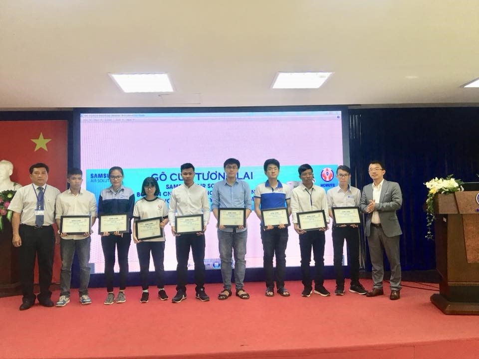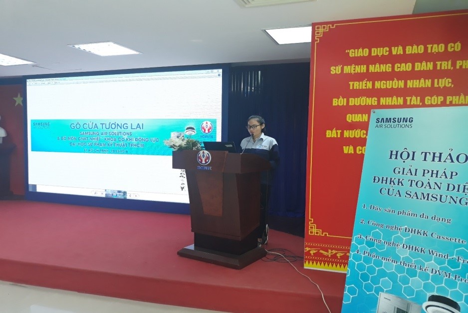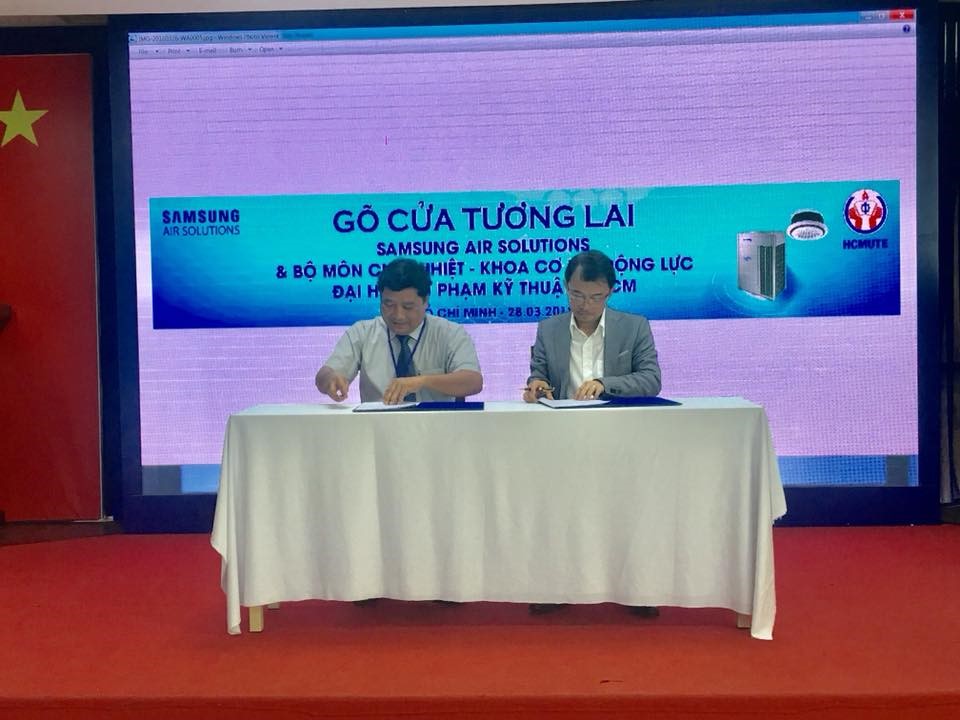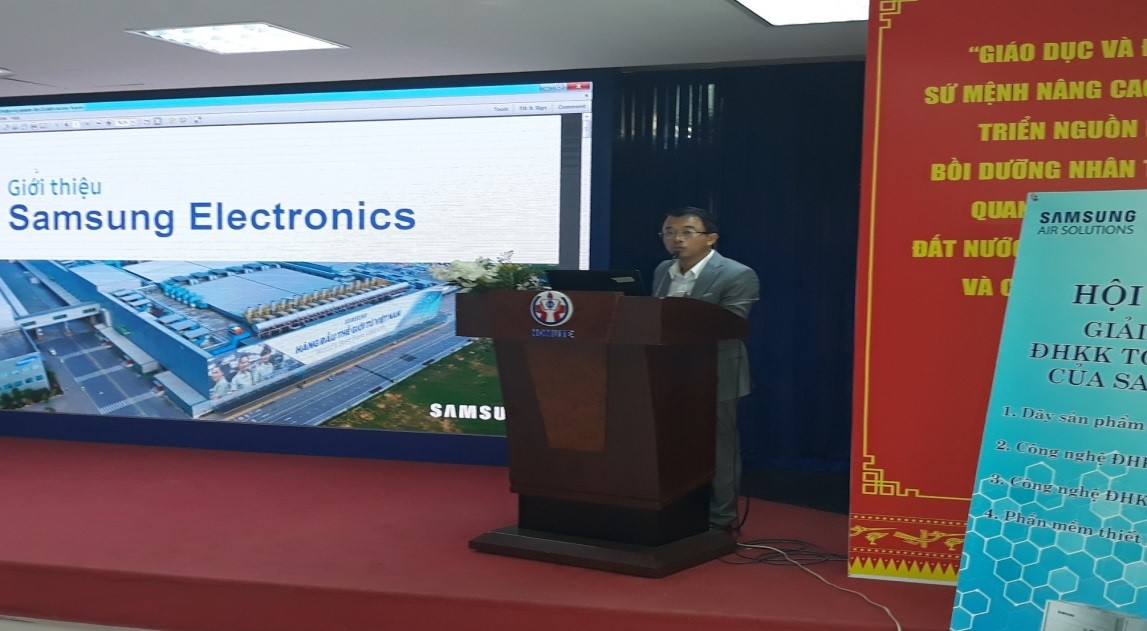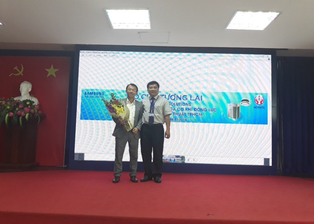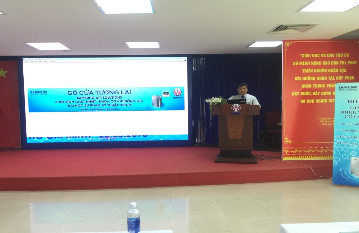 Vào lúc 8 giờ sáng ngày 28/03/2018 tại phòng họp 2 lầu 6 đã diễn ra lễ trao học bổng và hội thảo giải pháp điều hòa không khí toàn diện của Công Ty Samsung cho sinh viên khoa Cơ Khí Động Lực, ngành Công nghệ Kỹ thuật Nhiệt, trường ĐHSP Kỹ Thuật Tp.HCM . Đến dự buổi hội thảo có sự tham dự của ban lãnh đạo,thầy cô bộ môn đến từ khoa Cơ khí Động lực và đại diện của quý công ty Samsung cùng hơn 150 sinh viên. Về phía khoa Cơ Khí Động Lực có sự hiện diện của ThS. Huỳnh Phước Sơn – Trưởng Khoa Cơ khí Động lực , TS. Lê Minh Nhựt – Phó trưởng Khoa Cơ khí Động lực, Thầy Đường Minh Hiếu- Phó Trưởng Phòng Quan Hệ Doanh Nghiệp, và một số giảng viên trong Khoa Cơ khí Động lực. Đại diện của công ty Samsung có sự hiện diện của Ông Lê Việt Hùng- Giám Đốc Ngành hàng Điều hòa Không khí Samsung, Nguyễn Bá Nghị và một số anh chị trong công ty Samsung.