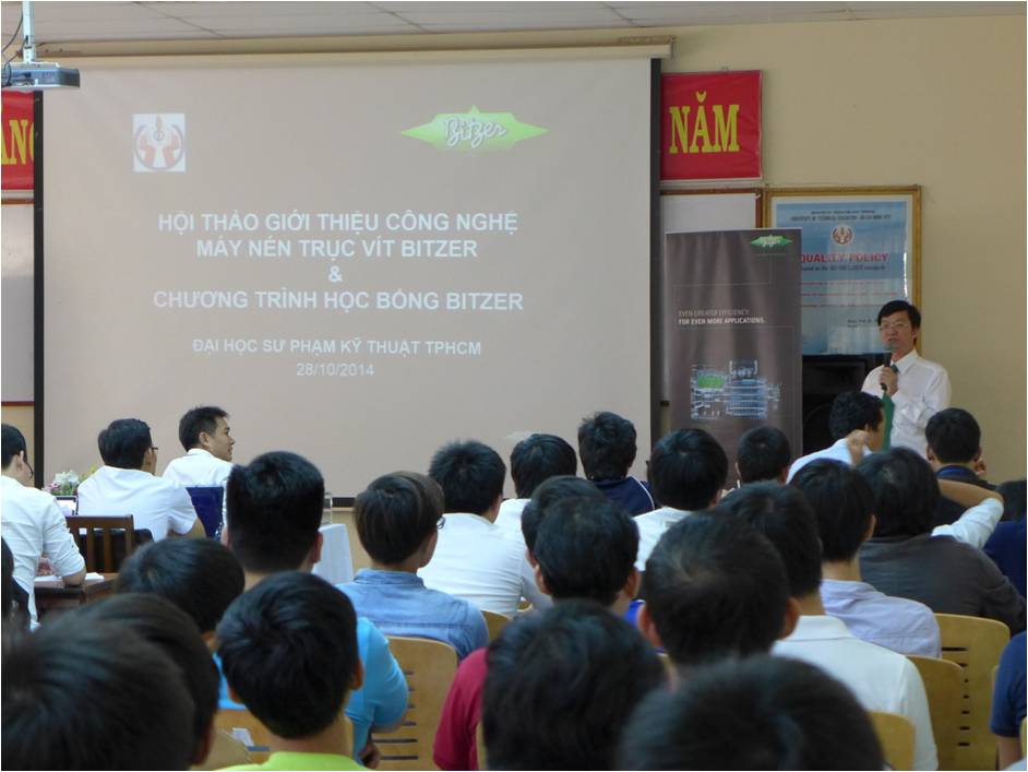Buổi hội thảo diễn ra khá sôi nổi với sự trình bày của chuyên gia Bitzer VN. ThS. Ngô Quang Trường – Trưởng đại diện của Bitzer VN đã mang đến cho sinh viên những kiến thức bổ ích về công nghệ máy nén trục vít. Bên cạnh đó các bạn sinh viên cũng khá hào hứng và đã đặt rất nhiều câu hỏi nhằm tìm hiểu sâu hơn về công nghệ mới này.