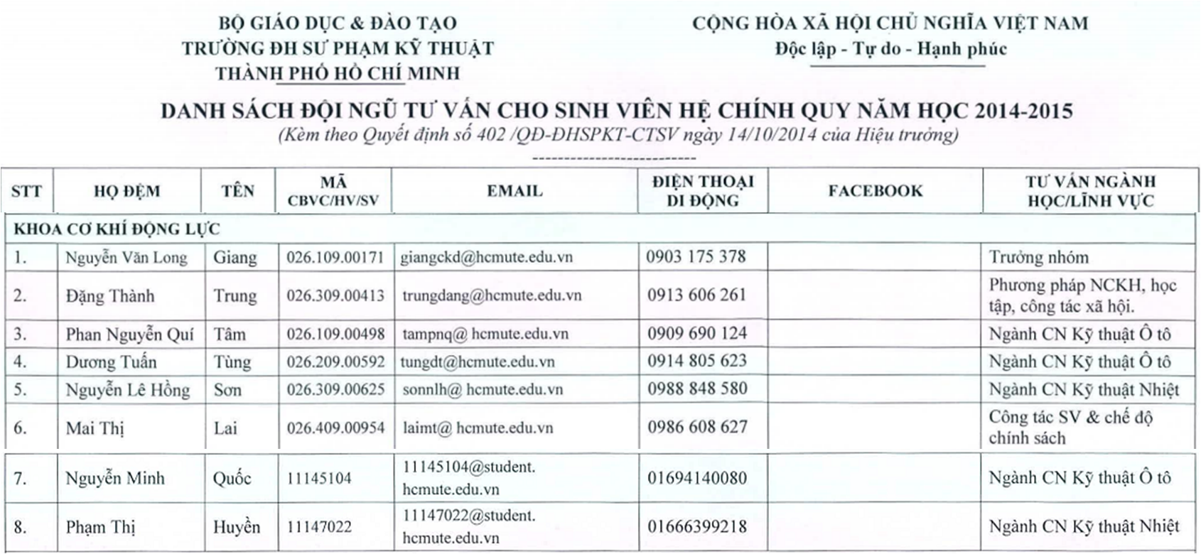 DANH SÁCH TƯ VẤN VIÊN KHOA CƠ KHÍ ĐỘNG LỰC
