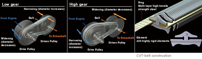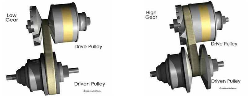 Khác với hộp số AT, CVT không sử dụng bánh răng để thay đổi hệ số truyền động lực mà sử dụng 2 pu-li (ròng rọc thông minh có thể thay đổi đường kính) được kết nối bằng dây cu roa (đai truyền). Việc sử dụng pu-li giúp cho CVT thay đổi tỷ lệ truyền động lực của trục dẫn động đầu vào (từ động cơ) và đầu ra (trục truyền động chính) một cách liên tục, loại trừ được khoảng thời gian hẫng, giúp tiết kiệm nhiên liệu.
