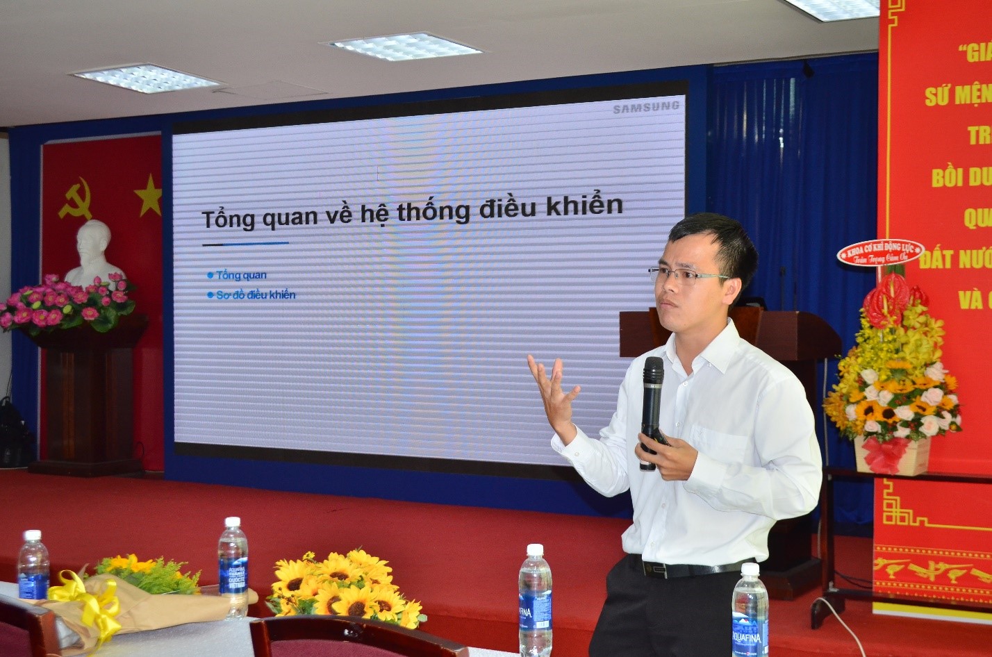 Thầy Huỳnh Phước Sơn đại diện khoa Cơ Khí Động Lực trao tặng lẳng hoa tươi thắm cho công ty Samsung như một lời cảm ơn