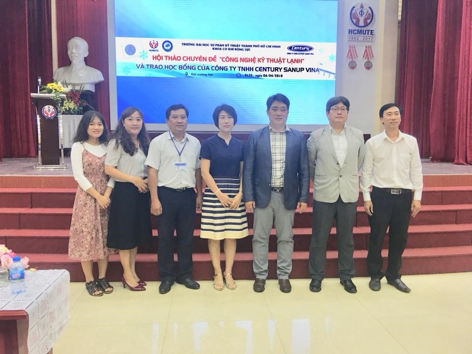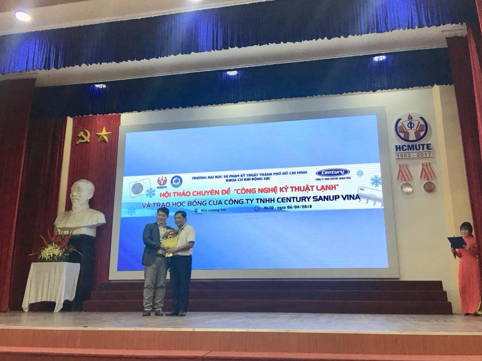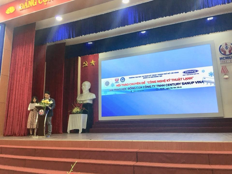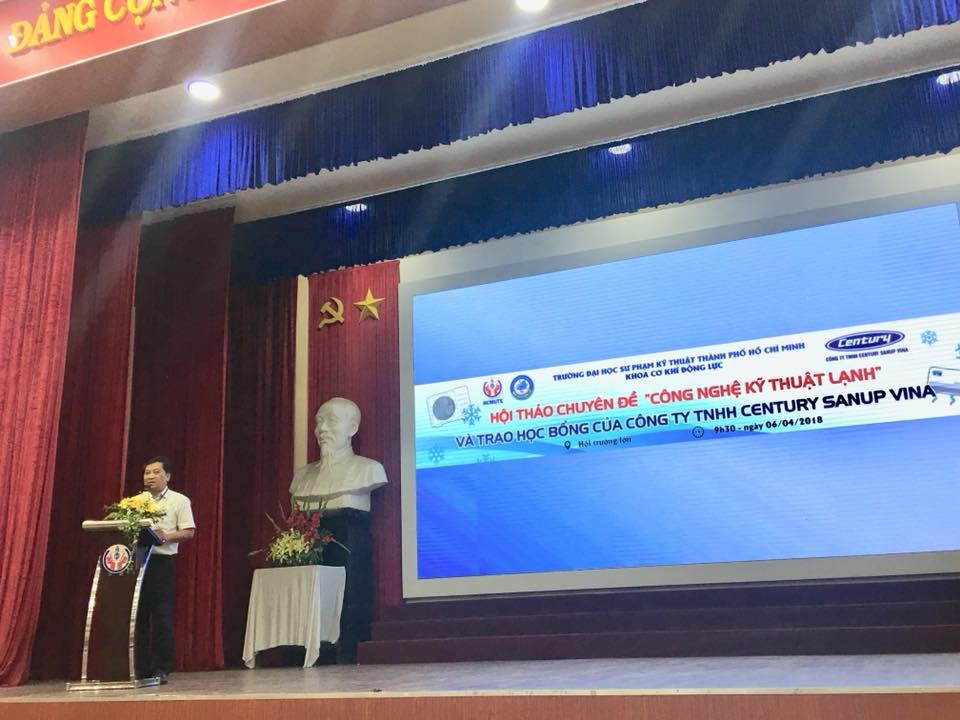Vừa qua ngày 6/4/2018 vào lúc 9h30 tại Hội Trường trường ĐH Sư phạm Kỹ thuật TPHCM đã diễn ra buổi Hội Thảo giới thiệu về Công Ty và trao học bổng cho sinh viên ngành Công Nghệ Kỹ Thuật Nhiệt của công ty Century Sanup Vina(Korea). Đến dự buổi hội thảo có sự tham dự của ban lãnh đạo khoa Cơ khí Động lực và đại diện của quý công ty Century Sanup Vina(Korea) cùng hơn 150 sinh viên. Về phía khoa có sự hiện diện của ThS. Huỳnh Phước Sơn – Trưởng Khoa Cơ khí Động lực, TS. Lê Minh Nhựt – Phó trưởng Khoa Cơ khí Động lực, và Giảng Viên BM CN Nhiệt-Điện Lạnh, về phía công ty Century Sanup Vina(Korea) có Ông Lee Hwi-Dong- Giám đốc công ty Century Sanup Vina(Korea) và một số anh chị trong công ty Century Sanup Vina(Korea).