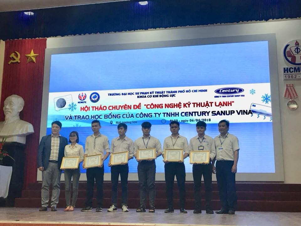 Tiếp theo buổi hội thảo, để gắn kết mối quan hệ giữa khoa và Quý Công ty. Công ty Century Sanup Vina(Korea) cũng đã trao tặng 06 suất học bổng cho sinh viên suất sắc ngành Công nghệ Kỹ thuật Nhiệt. Thông qua những suất học bổng, công ty Century Sanup Vina(Korea) đã động viên,tạo động lực cho các sinh viên trong quá trình học tập.