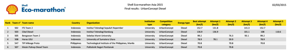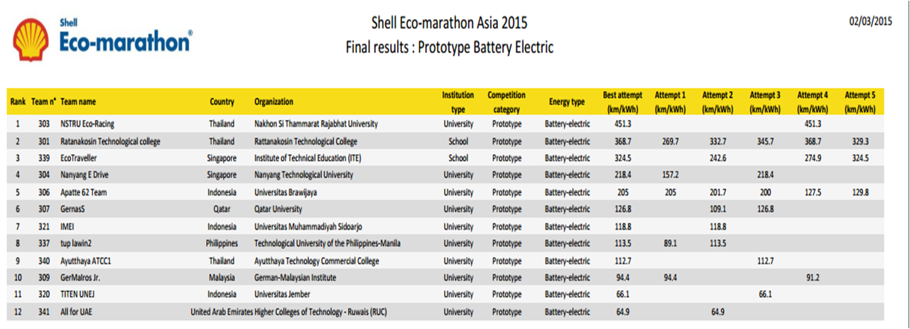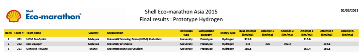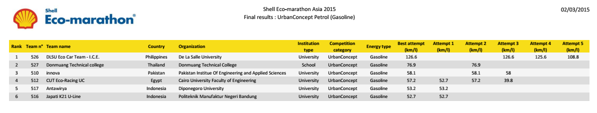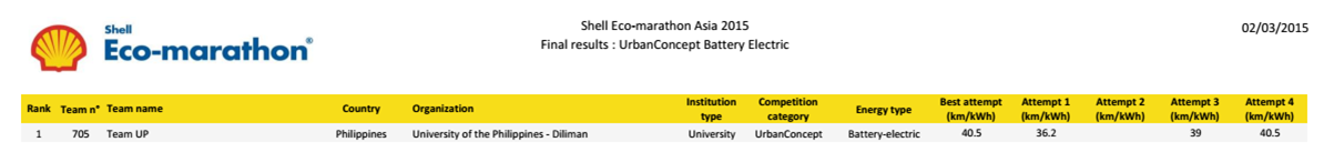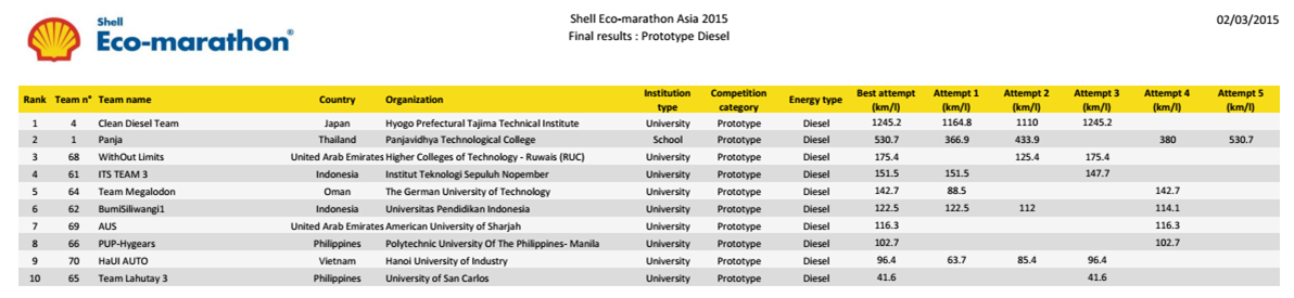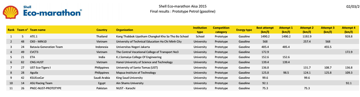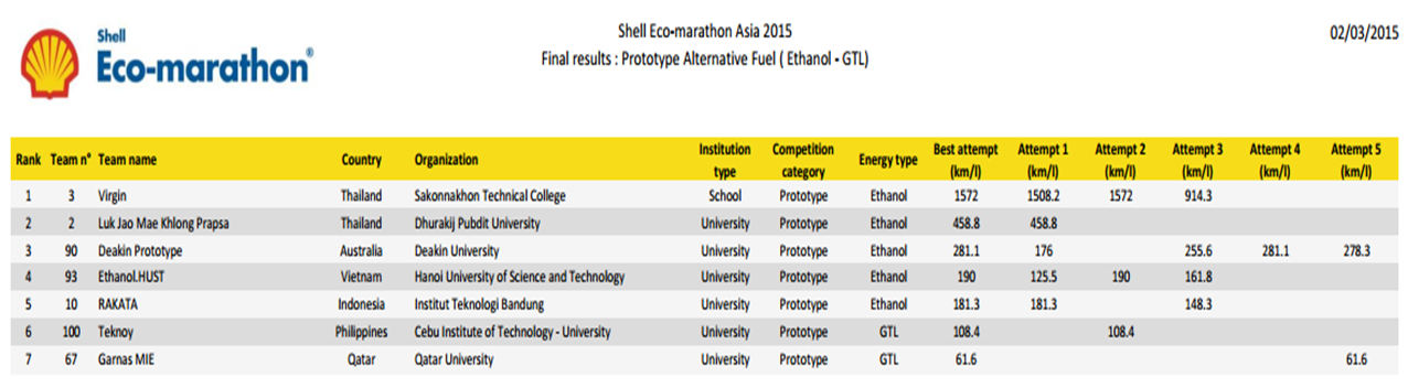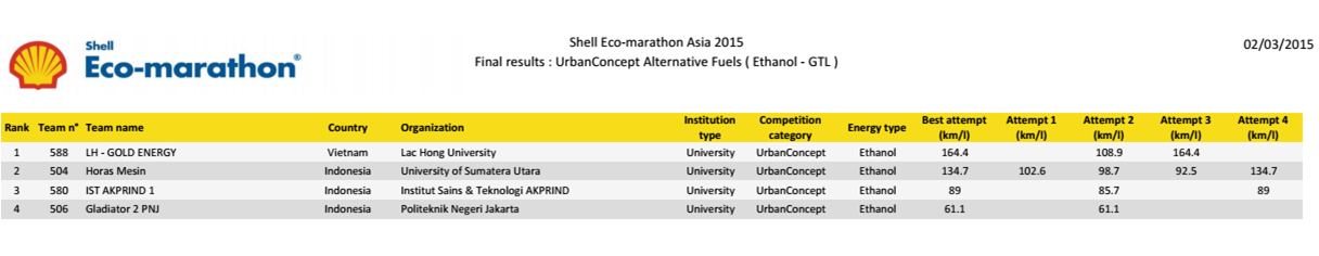 Được bắt đầu từ năm 1985, cuộc thi xe sinh thái tiết kiệm nhiên liệu Shell ECO-Marathon lần thứ 30 được tổ chức tại Philippines từ ngày 25 tháng 2 đến ngày 1 tháng 03 năm 2015 đã thu hút 129 đội tham dự đến từ các trường Đại học và cao đẳng của 17 quốc gia trong khu vực Châu Á Thái Bình Dương.