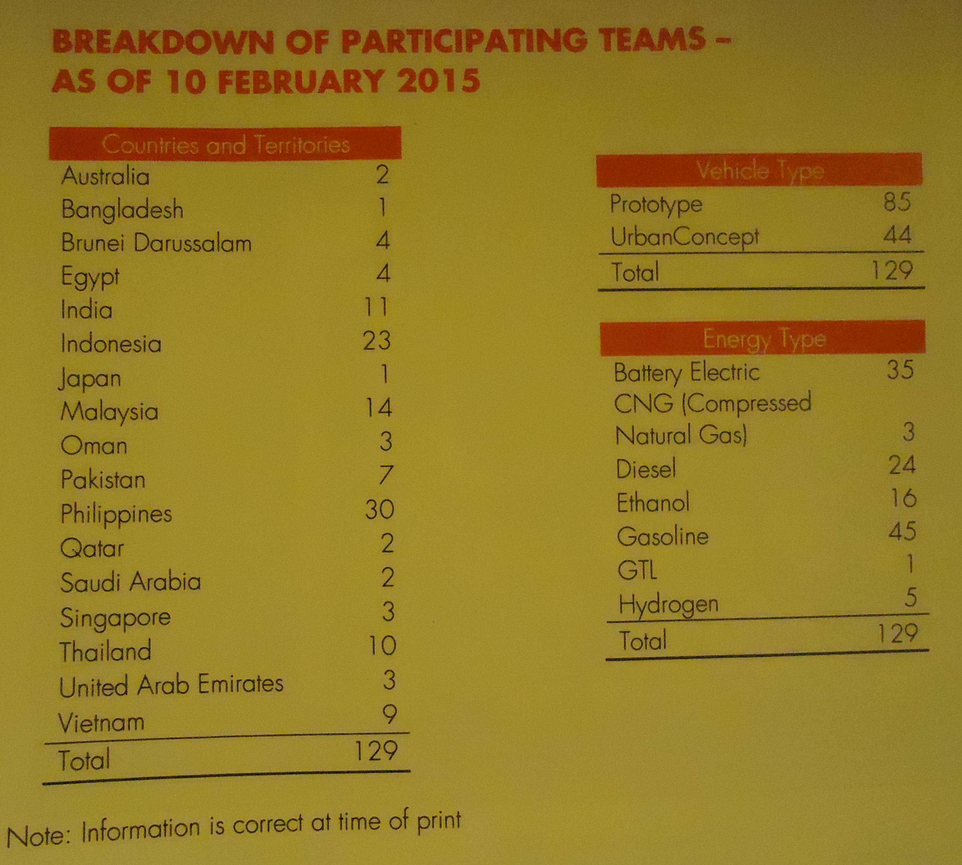Việt Nam có 09 đội tham dự cuộc thi với 2 hạng mục Prototype (Xe 3 bánh) và Urban Concept (xe 4 bánh), trong đó ĐH Sư Phạm Kỹ Thuật Tp.HCM 1 đội, ĐH Công nghiệp Tp.HCM 2 đội, ĐH Công nghiệp Hà Nội 1 đội, ĐH Bách Khoa Hà Nội 2 đội, ĐH GTVT Hà Nội 1 đội, ĐH Lạc Hồng 1 đội và CĐ GTVT TW3 1 đội.
