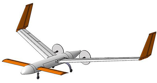The Vives Litus UAV features a canard configuration with swept wings and a vertical tail at each wing tip.