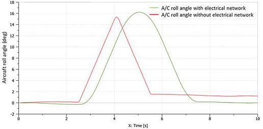 This graph compares the resulting roll angle and roll angle of the same maneuver but where the user input is sent directly to the flight dynamic module, hence without servo properties. This latter plot illustrates the effect of the electrical system model on the flight dynamics of the aircraft.