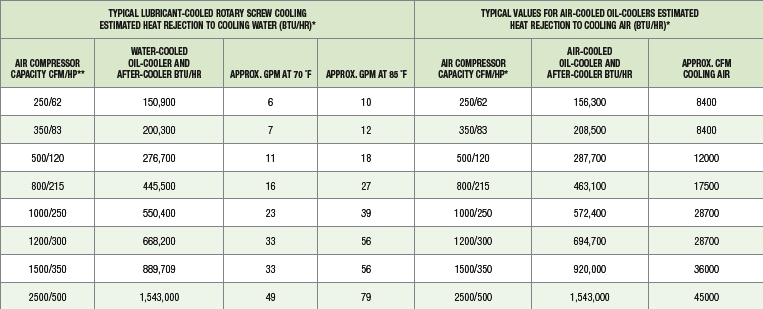 The standard rating, for air compressor cooling water requirements, is how many gallons of water per 1,000 btu/hr is rejected into the cooling water flow. Air compressors generate a high rejection load due to their very basic inefficiency — i.e. it takes 7 to 8 input horsepower to supply 1 hp of work in compressed air. This creates a heat-of-compression generated during the process reflecting this inefficiency. Energy input not converted to work shows up as heat. This heat has to be removed for the equipment to run and for the plant to be able to use the air. Particularly today, where dry compressed air is often critical, it must be reliably and effectively after-cooled and dried to a specified pressure dew point using compressed air dryers.