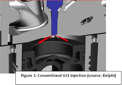 Delphi has achieved excellent GCI combustion results in conventional engine configurations, with an injector inserted through the cylinder head injecting towards an approaching piston (Figure 1).