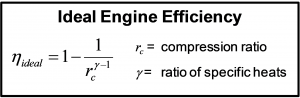 Lean combustion – excess air relative to fuel – provides the majority of that improved thermodynamic efficiency in compression ignition by diluting the fuel to air mixture, resulting in lower combustion temperatures and reduced heat loss. For those mathematically inclined, we can refer to the equation for ideal engine efficiency: