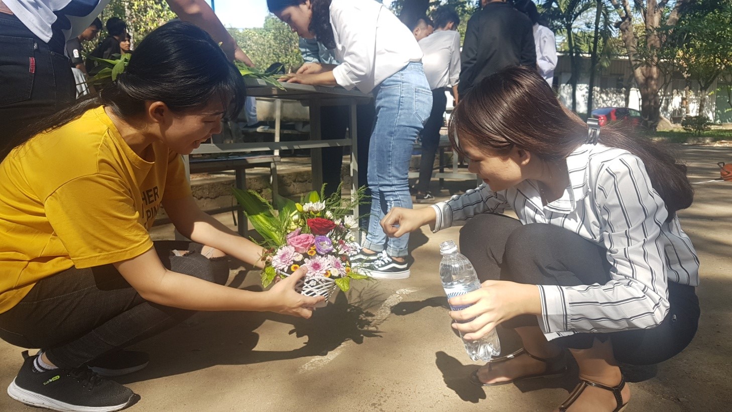 Đúng 8h30 cuộc thi bắt đầu ai nấy đều thi triển khả năng của mình mỗi người mỗi việc người làm bếp người cắm trang trí hoa hết sức sôi nổi.