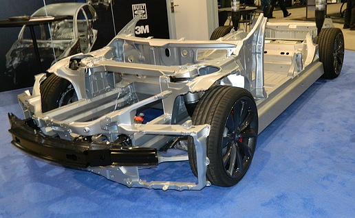 This Tesla chassis is all aluminum, and structural repair parts are restricted to approved shops. It was on display at the SEMA Show by SCRS.