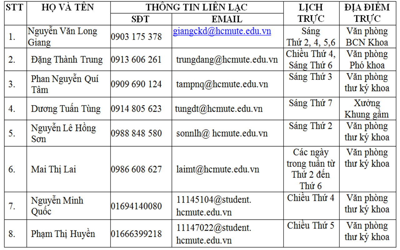 Theo QĐ số 389 /QĐ-ĐHSPKT-CTHSSV ngày 19/9/2014 quy định về công tác Tư vấn đối với SV thay cho CVHT, Khoa CKĐ thông báo đến toàn thể SV được biết thông tin về nhóm tư vấn viên của khoa và lịch trực trong tuần của nhóm tư vấn viên như sau: