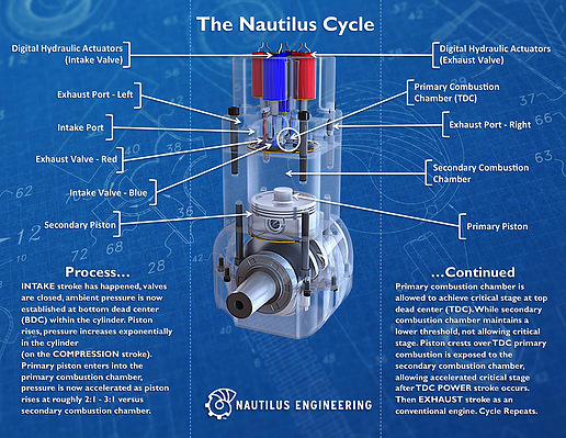 Air and fuel are mixed outside the cylinder in the intake manifold via a fuel injector ideally operating at something approaching 160-200 psi. A couple of potential design options for the Nautilus engine’s small primary combustion chamber mean compression ratio could be fixed (say for small single-cylinder engines) or enable a variable compression ratio of perhaps 1.5 to 2.5 times the large secondary combustion chamber’s fixed compression ratio of somewhere around 10.5:1. Twin intake and exhaust ports are valved with conventional-looking poppets envisioned to be driven by digital hydraulic (or perhaps even electric) actuators. The valves also could be operated by a more conventional camshaft arrangement.